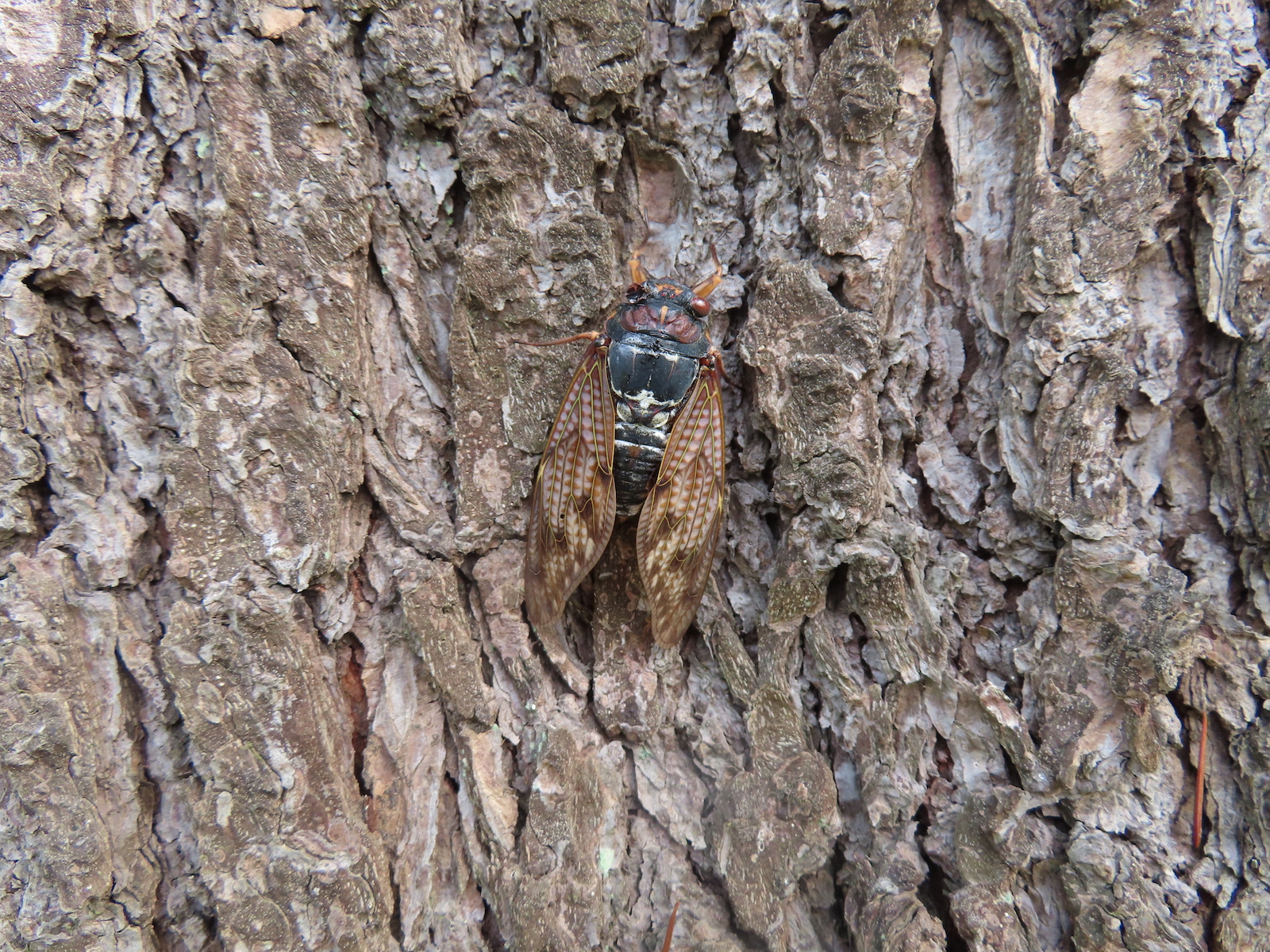 Cicada: It was on its back near the tree next to me in the park. I helped it up and tried to put on the tree, but it seemed to like my finger. I did finally get it to go onto the tree. Sad, but it was striving hard to live through what was probably its last day.