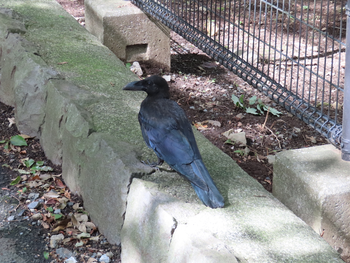 Crow: It was on the little road through the woods when I came by. I stopped because I thought it was injured. It first got onto the rocks by the fence. But when I got close, it flew up onto the fence. No sign of injury. But it wouldn’t move. I tried to encourage it to go into the woods by touching its tail. It just turned around to face me. It seemed to be suffering heat exhaustion, hence its mouth is open in the photo with my finger. I couldn't do anything for -- no container for water -- so I talked to it for awhile trying to convince it to stay out of the road. I went back the next day. No dead crow anywhere, so it seems to have survived.