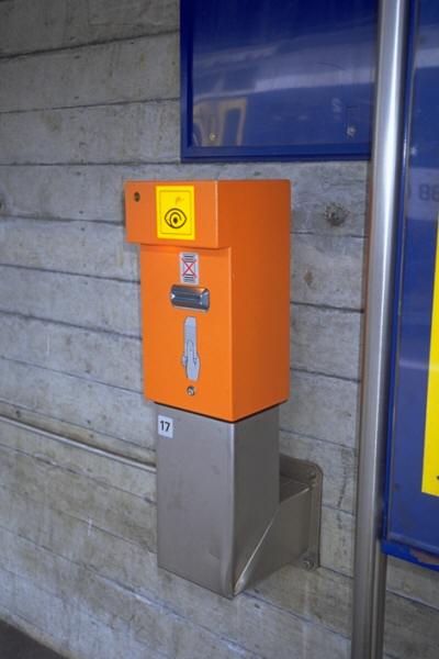 何処から始めたらよいか迷うが、顕著なのは改札がないことである。ホームが平行した道に面していて、何処からでも直接歩道に出られるのさえ見たことがある。だからその代わりは車内の車掌による検札ということになる。車掌が来なければ切符を買わなくたってどうってことはない。ただし不正乗車が見つかったときは多額の罰金が待っている。これでバランスがとれているのだ。切符を買って持っていてもそれだけでは駄目で、同一切符で何回も使う意図を持った不正乗車と見なされ罰金の対象になる。従って切符を買ってから大抵ホームの付け根、階段からホームに出る所にある"刻印器"(Entwerter)に差し込んで日付、時刻を刻印する。これで初めて乗車可能な切符となる。