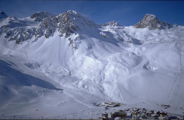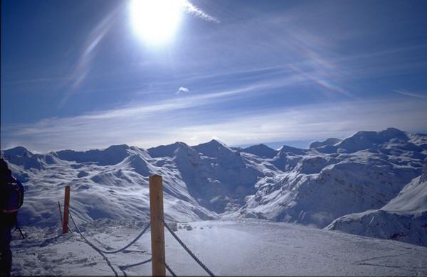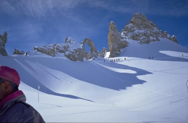 標高3,000m付近に2つの氷河があり、夏スキーも出来るとのことである。もちろんここも滑ったが、冬の間は全体が雪に覆われていてどこが氷河なのかはっきりは判らなかった。また永年の風化作用によってできた"針の穴"(L'AIGUILLE PERCEE)という今にも崩れそうな環状の岩の造形も面白かった。 スキー場内の最高峰はグラン・モッテ(3,656m)でリフトで登れる最高地点は3,456mである。独断と偏見を以て日本のスキー場に例えれば「志賀高原一帯と熊の湯、横手山をくっつけ標高差を2倍にして、リフトのつなぎを良くしたもの」と表現しておこう。