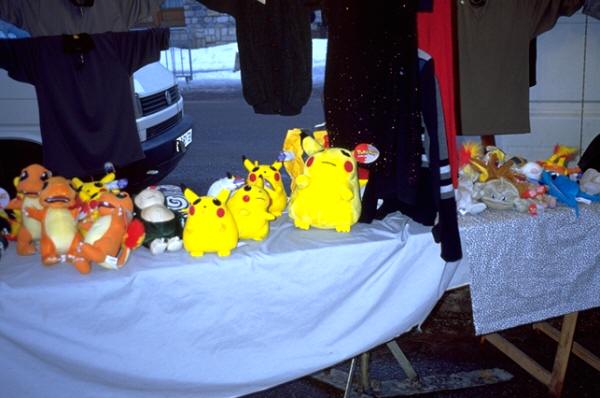 何日目だったか忘れたが、夜市が立つた。衣類、食料品、日用品、雑貨などの露店が歩道を埋め、見るだけで楽しかったが、人形を扱う店で"ピカチュウ"のぬいぐるみを見つけた。