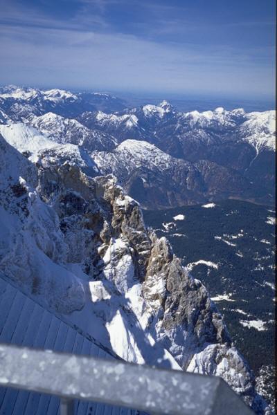 一人の旅では喋らないことには何もできないが、絶好の場はリフトの上で、積極的に話しかけるように努めた。相手もひまだし注目して聞いてくれるので結構会話のやり取りが上手く成立するのである。数十人とは話していたかと思う。始めのフランスではまずドイツ語を話す人を見つけることから始めなければならなかったのだがこれが結構難しい。仲間内で喋っているのでスピードは早いし、ドイツ語だと判るのにも結構時間が掛かる。シュトゥットガルトから来ているおばさんと話したことを記憶している。話す内容はたいしたことはなく時間も直ぐ経ってしまう。スイス以後はそんなこともなかったが、反対にオーストラリア人と分かり途中で英語に切り換えたこともある。恰幅の良い人はロシヤ人だったが、連邦内の何とか共和国?の標高5,000mのスキー場の話をしていた。確かに帰って調べてみるとヨーロッパの最高峰はモンブラン(4,807m)ではなくてカフカス山脈のエルブルース山(5,642m)でグルジア共和国との国境に?にあった。ドイツ語の実力は私と同程度?格好はスキー連盟の役員風のワンピースを着ていたのだがスキーの腕前はたいしたことはなかった。ツークシュピッツェで地元の若い女の子と話したり、結構楽しかった。別れ際に「良い一日を」とか「よい週末を」をはじめとして何種類もの挨拶を早口でするのだがとてもついて行けるスピードではないのでただ「Auf Wiedersehen!(さようなら)」としか言いようがなかった。来年までに受け答えを勉強して置かねば・・・。