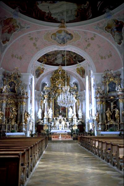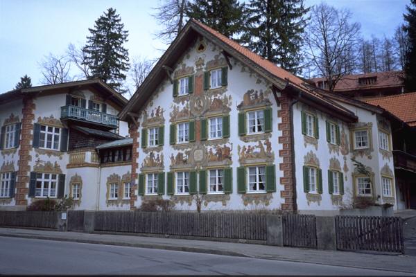来る時のタクシーに時間を指定し迎えを頼んで置いたので、またそのタクシーでオーバーアマガウに戻った。タクシー料金は往復で約80DM(¥4,500)だった。オーバーアマガウではロココ様式がたいへん美しいカトリック教会や案内書にでていたフレスコ画で装飾された建物、「赤頭巾ちゃん」「ヘンゼルとグレーテル」「七匹の子山羊」など写真に収めてきた。駅に戻り15:08発の列車に乗っていたら、後で乗ってきたお婆さんがにこにこして話し掛けたそうにしているので、これまでの旅行の話をした。歳を聞いたら87歳と言っていた。手持ちの和紙の葉書をあげたら喜んで、握手をして途中の駅で降りて行った。ムルナウで乗り換え16:53この旅の最終滞在地ミュンヘンに着いた。