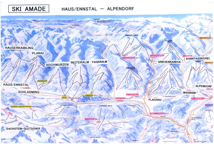 東からFlachau(920m)-Griessenkareck(1991m)-Waglain(850m)-Sonntagskogel(1850m)-Alpendorf(800m)と連なる。Griessenkareck-Waglain間はリフトは無いが、距離も短く頻繁にスキーバスが通う。我々はAlpendorfで時間切れ、引き返さざるを得なかった。ここから先リフトの接続 は無いが、Grossarl(920m)まで行き、Kreuzkogel(2027m)を越えれば3年前に訪れたバート・ガ タイン地区の入口、ドルフ・ガスタインに達する。