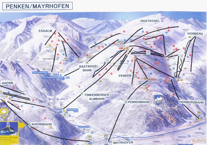 谷の平坦な部分はマイヤーホーフェンまでで、急に高度を上げ、更にバスで40分程谷の最奥ヒンタートックス(Hintertux)まで続く。中心はペンケン(Penken)とこれに連なるスキー場であるが、その他に数カ所の滑走距離150Kmほど、日本の規模で言えばかなり大きなスキー場が点在し、合わせて滑走距離:636Km、リフト数:174基の一大スキー場を形成している。すべてリフトパスは共通で、無料のスキーバスでつながれている。ツィラータール鉄道もこの中に組み込まれていて、リフトパスがあれば無料。