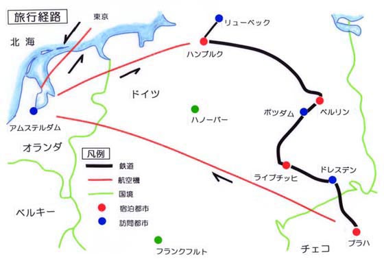 成田=アムステルダム=ハンブルク:3泊−ベルリン:3泊−ライプチッヒ:2泊(内1日ドレスデンへ)−プラハ/チェコ:3泊=アムステルダム=(機中泊)=成田 (=:航空機、−:鉄道)