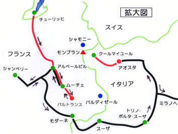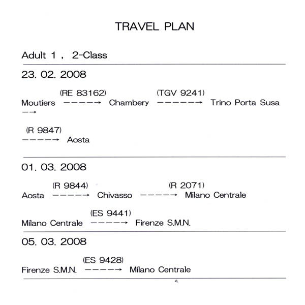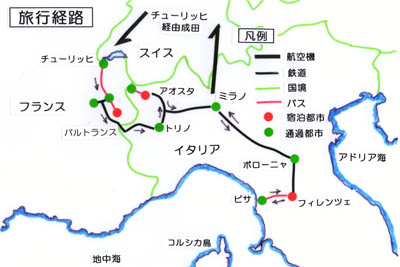 成田=チューリッヒ=ジュネーブ−(バス)−バルトランス(7泊)−(バス)−ムーチェ−(鉄道,シャンベリー、モダーネ、トリノ・ポルタ・スーザ経由)−アオスタ(7泊、クールマイユールを含む)−(鉄道,ミラノ経由)−フィレンツェ(4泊>、ピサ観光を含む)−(鉄道)−ミラノ(1泊)=チューリッヒ=成田