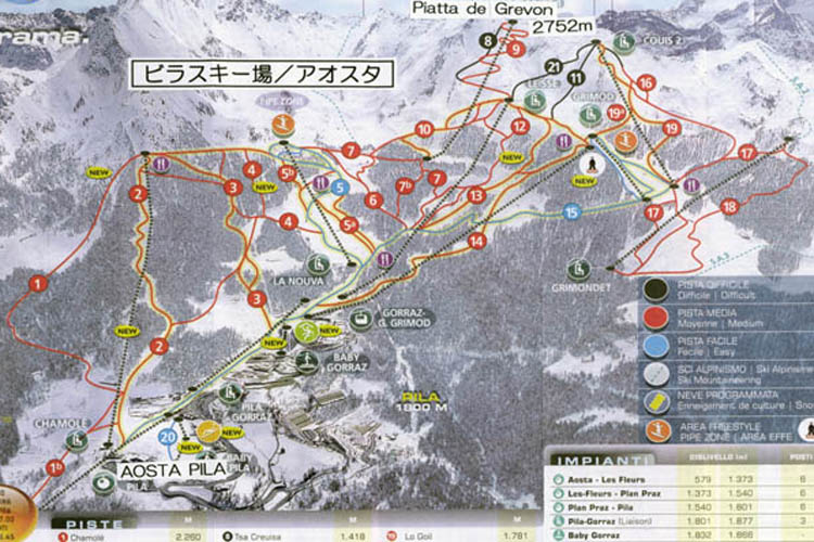 初めのロープウェーは中間駅が2つもある結構長いものだが、既に春の気配で雪が少なく途中の乗り降りは皆無、輸送専用となっていた。図の頂上Platta de Grevon付近の上級(黒)コース3つはオフピステだが、雪が全く降らず堅いバーンになっていた。No.2のピステは中級コースだが結構長く、快適に滑ることが出来気持ち良かった