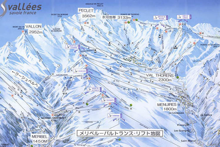 これまでフランスのスキー場は2001年のバルディゼール、2006年のシャモニー、今回は3度目である。フランスは中々足が向かずにいたが、どうせツアーに参加するならという事で今年は残る有名な大スキー場トロアバレーを選んだ。その「三つの谷」の名の通り、バルトランス、メリベル、クーシュベルなど一帯を指す名称であるが、この内のバルトランスに一週間滞在した。殆ど場所の見当の付かない方の為にこのスキー場を説明すると、レマン湖の西端に位置するジュネーブから直線距離で南に100Km余、イタリア国境に近いバルディゼールからは35Km程西にある。北東に向かってメリベル、クーシュベルがリフトで繋がっていて、ヨーロッパアルプスの最高峰モンブラン (4807m) の方向へ近付いて行く。このスキー場を紹介するに当たり従来方法ではうまく行かない点に気付き、暫く筆が止まってしまった。