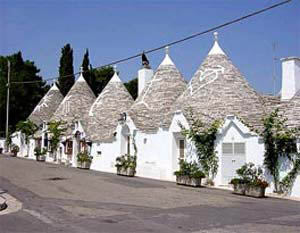 アルベロベッロにはトゥルッリTrulliと呼ばれるこの地方独特の家が集まった2つの集落がある。(世界遺産)トゥルッリはキノコのような円錐形の灰色の屋根と白い壁を持つ家である。ここに立つとお伽の国に迷い込んだようだと書かれた記事を見たが、確かに独特の楽しげな雰囲気を持っている。