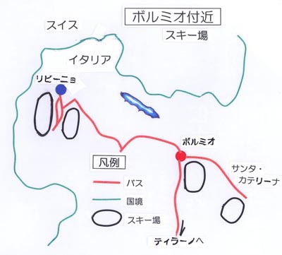 リビーニョはボルミオ、バスセンターから約一時間、スイス国境に近い所にある。通常の路線バスを使うのだが広域のリフトバスなら有効。上図で判るようにスキー場は街の両側2つに別れている。左のスキー場は手前のトレパッレで降りても良い。ここは既に森林限界でリフト1本で尾根に出られ、素晴らしい世界が突然出現する。この広々とした感じはボルミオ以上である。尾根の奥には結構滑り応えのあるコースもあり十分楽しめた。リビーニョの街は結構大きく循環バスがあるほどだ。谷の幅も広く、右のスキー場に渡るには数百メートル歩かねばならず、これが欠点とも云える。左はほぼ北斜面、右は南斜面。