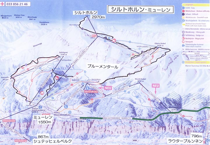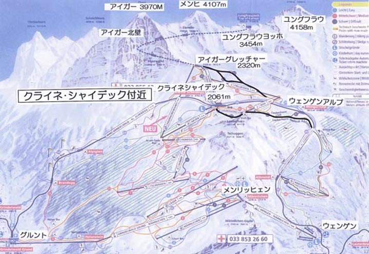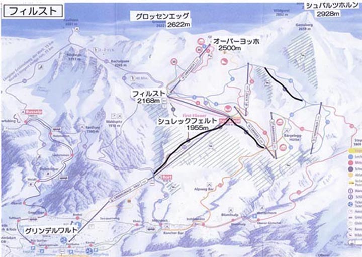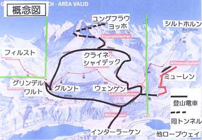 ユングフラウ・ヨッホ付近はスキーは出来ないので、スキー場としては上図クライネ・シャイデック、フィルスト、シルトホルンの3っで構成される。