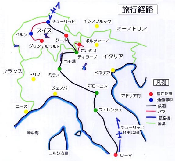 成田=チューリッヒ−(バス)−グリンデルワルト(7泊)−(バス)−チューリッヒ(以上ツアー参加)−(鉄道)−クール(1泊)−(鉄道−ベルニナ特急)−ティラーノ−(バス)−ボルミオ(6泊)−(バス)−ティラーノ−(鉄道)−ミラノ−ローマ(5泊)=チューリッヒ=機中泊=成田 (=:航空機、−:鉄道 or バス)