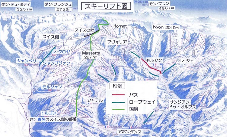 このスキー場の名を知ったのは2008年トロアバレーの時、フランス人ガイドから聞いたのが初めてである。日本では殆ど知られていないが、滑走コース総延長:650km、リフト数:197基とヨーロッパの中でも最大級の大きさを誇る。但し標高は900〜2500mと低い。なおモルジンはレマン湖の南にあり、ジュネーブ空港から約1時間半、定期バスも運行している。
