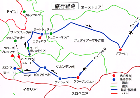 成田=ウィーン=クラーゲンフルト(2泊)−フィラッハ−リエンツ−(バス)−ハイリゲンブルート(7泊)−ピッツタール−ラートシュタット−(タクシー)−フラッハウ(5泊)−(バス)−ラートシュタット−グラーツ(3泊)=ウィーン(機中泊)=成田
