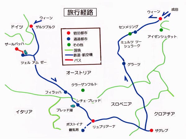 成田=ウィーン=ザルツブルク(1泊)−ツェル アム ゼー−(バス)−ザールバッハ(7泊)−(バス)−ツェル アム ゼー−ブレッド湖往復(タクシー)−リュブリアーナ(3泊、内1日ポストイナ鍾乳洞往復)−ザグレブ(3泊)−グラーツ−ミュルツ ツー シュラーク−センメリング−ウィーン(2泊)−ウィーン空港=(機中泊)=成田