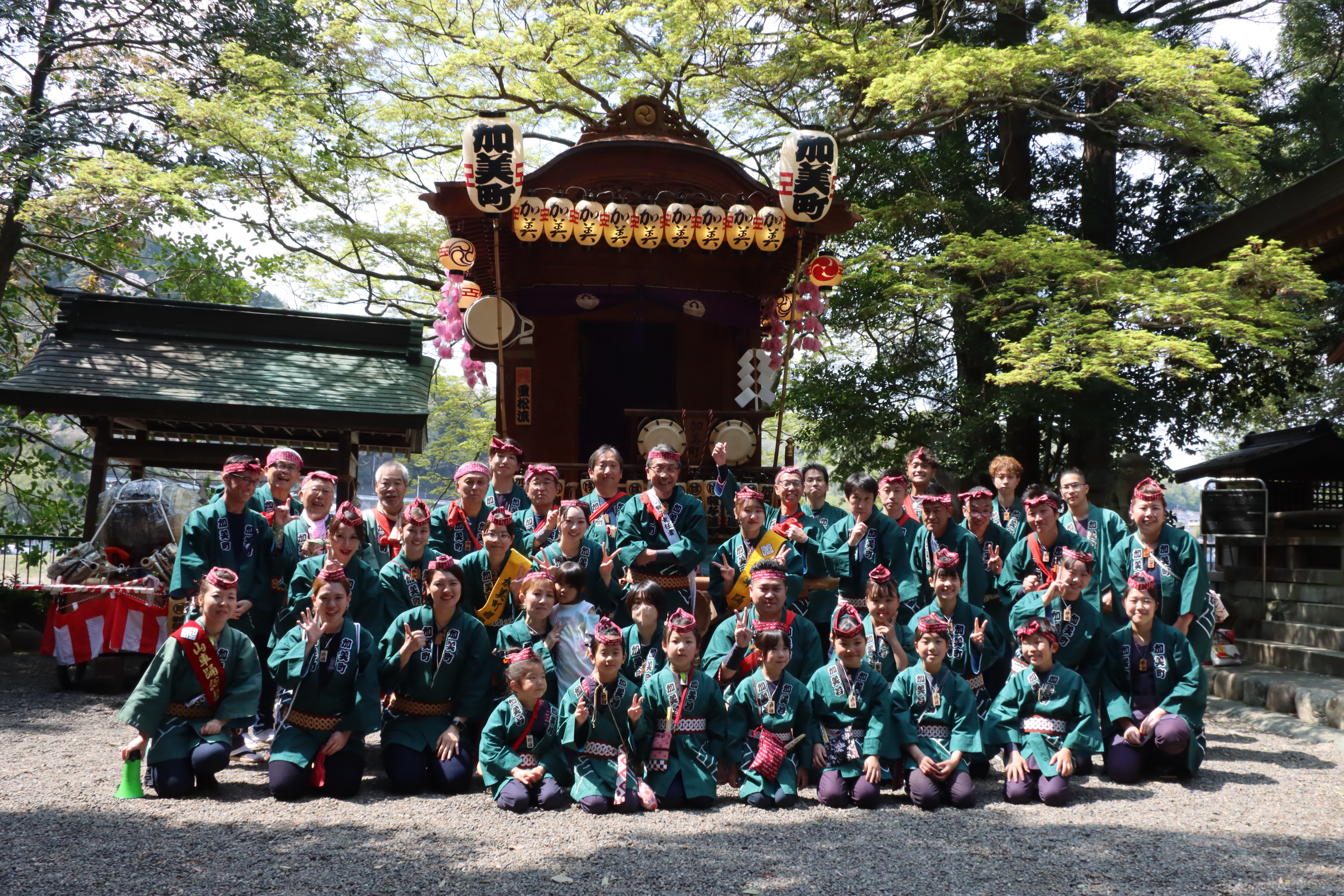 加美町では江戸末期から明治中頃までは「神田囃子」が伝承されていましたが「スリアイ」で負けてしまうとのことで、明治5年新たに山車を新造した際、阿蘇神社と繋がりのあった所澤より山車人形を借りた記録が残されており、同時期に「重松流祭囃子」を習得したと伝えら現在に至っております。