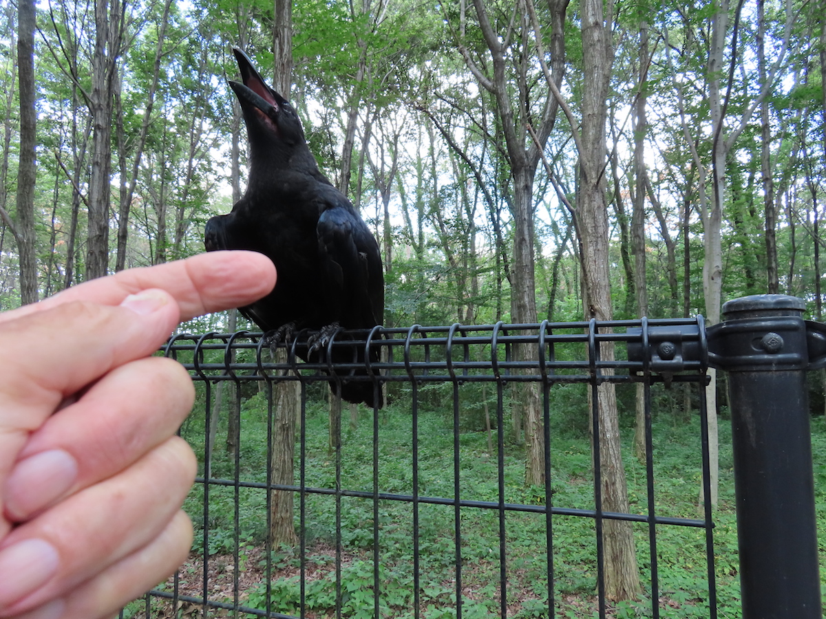 Crow: It was on the little road through the woods when I came by. I stopped because I thought it was injured. It first got onto the rocks by the fence. But when I got close, it flew up onto the fence. No sign of injury. But it wouldn’t move. I tried to encourage it to go into the woods by touching its tail. It just turned around to face me. It seemed to be suffering heat exhaustion, hence its mouth is open in the photo with my finger. I couldn't do anything for -- no container for water -- so I talked to it for awhile trying to convince it to stay out of the road. I went back the next day. No dead crow anywhere, so it seems to have survived.