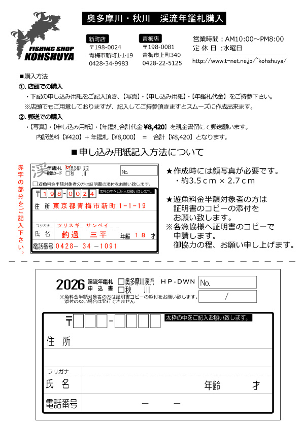 奥多摩川/秋川渓流鑑札を取り扱っています。 鑑札代金 8,000円 (要.顔写真)3.5cm×2.7cm ※現金決済のみとなります。 右記詳細をご検討下さい。 @ 店頭にて販売 (青梅店/新町店) A 郵送での購入 |