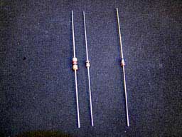 部品の調達5(電流制限抵抗偏) LEDはダイオードの仲間ですので流れる電流(順方向電流:IF)により順方向電圧(VF)の決まりがあります。 電流制限抵抗の計算式は以下の通りです。 抵抗の代わりに定電流ダイオード(写真右側、15〜18mA用)を使用する方法もあります  |
