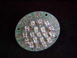 お待たせしました、工作開始です。 基板のシルク印刷された部分にLEDと抵抗を挿入し、ハンダ付けをして行きます。  |