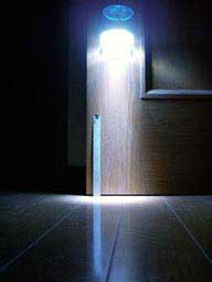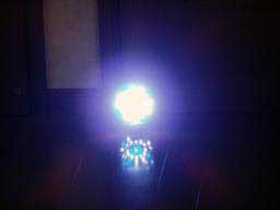 配光パターン(正面)です。 真正面約5mよりの撮影ですが思ったより明るいです。 ただご覧の通りかなりの狭照射角で、正面より約15度ずれただけでこれだけ光量が落ちてしまう(右写真)のでスポットランプ的な使い方になるでしょう。  |