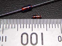 Regulative Diode)で足の有る方がE−153、足の無いのがF−153で 4.3〜25Vの電圧範囲で12〜18mAの一定電流を得ることができる。 今までは5mA程度のものが上限だったのだがここで15mA程度の供給が可能なCRDがリリースされた。 これはLED駆動に最適な電流範囲で、電源を変更した場合に抵抗値の再計算が必要な抵抗制御と違い、何も改造無く対応できるところが嬉しい。 おまけに発熱がない! ただ、残念なことに値段が高い(抵抗なら1本1円程度なのだが、E−153で50円、F−153で60円程度する)  |