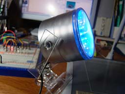 これが完成写真で、ペン立てケースより格段に立派になった。 ケースも銀色に塗ってしまったのでケースの反射も期待でき、また外部への発散もそれなりに防げていると思う。 ここまで綺麗にできてしまうと某社製のLEDランプが大変に高価なので廉価版として売り出そうか………などと思ってしまう。 これは 一応………非売品です。  |