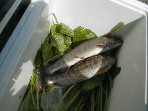 それでも なんとか ヤマメと イワナのキ−プサイズを釣る事が出来て一安心です...苦笑 実際釣れた時間は8時過ぎ日差しが 水面を照らし始めた頃からアタリが出で この時期にはめずらしい 瀬の中でアタリが来ました イワナが自分でヤマメが大ちゃんです しかし結局キ−プサイズはこの二匹だけ..あとは稚魚に毛が生えたみたいなサイズはちょこちょこっと釣れただけで 途中に自生していた ワサビを採る方が熱中してしまいました....笑 結論的に この川は当分の間解禁時のみの釣行になるでしょう...でもここで40センチオ−バ−のイワナがでたのはホントの話しです...