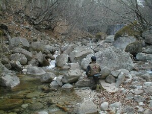 今回はあたらしいメンバ−の大工のだいちゃんです 後ろ姿ですが 詳しくは自己紹介欄をみてくださ〜い 今年は何故かなかなか釣りに行く機会がありません 原因は メンバ−の結婚によるものですが 人数が少ないと影響が多きすぎますね...それでなかなか行けないので 実績のある川で沢山釣ってストレス発散しようかと 山梨県の塩川に行って参りました まだ自分が20歳頃の塩川は ダムはまだ完成していなく 今ほど道もボコボコで観光客などほとんど居ない状況でしたが 今では道も整備され登山道の遊歩道も綺麗になって 増富温泉も町経営の綺麗な施設も出来て ずいぶん有名になってしまいました....あげくのはてに釣り雑誌に紹介されてしまい つり人が急増してしまって..絶対うらぎられなかった 塩川もあっと言うまに 魚影がなくなってしまいまして....あんなに ヘタクソだった頃の自分でも一日10匹以上は釣れたのですが今ではやっとこ釣れる状況です たぶん今後は当分釣りに行く事は無いと思いますが 自分が渓流世界に入る きっかけになった川なので とても寂しいです..秋は紅葉でとても綺麗なので 別の目的で行こうと思っています