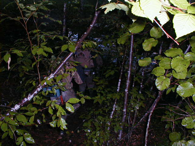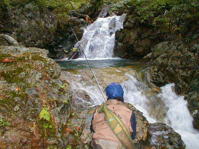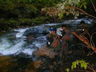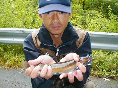 峠を越え河川の水量をみながら川沿いを走らせ なかなか水量的 渓相的に満足できる川がなかなか 見つからず さらに峠を越え下り道をはしらせていると 左手に条件にあう川が現れた 早速車を路肩に寄せ 作業開始 さっさと準備を整え いざ 入渓です 河床に来ると思っている以上に水量があり 期待度満点ですが 4人でやるには 狭く2人に別れ 貢 大ちゃんは本流 自分 ヨツは 支流へ向かうこととなり ここでお別れとなりました