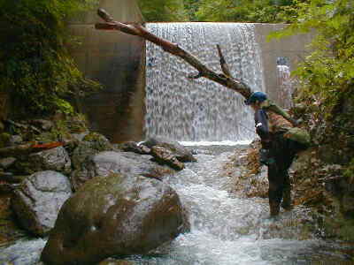 さて 自分は支流へと向かったのですが 本流への合流部分は水量的には無いのですが 上流に向かうにつれ水量が増してきて 30分も歩くと ご覧のような渓相が現れる いくつかの釜を攻めながら先へと進みアタリはあるのだが キープサイズになかなか手が届かずリリースの連続 すると目の前に人口の砂防ダムが現れた 本流からの最初の魚止め 期待大である