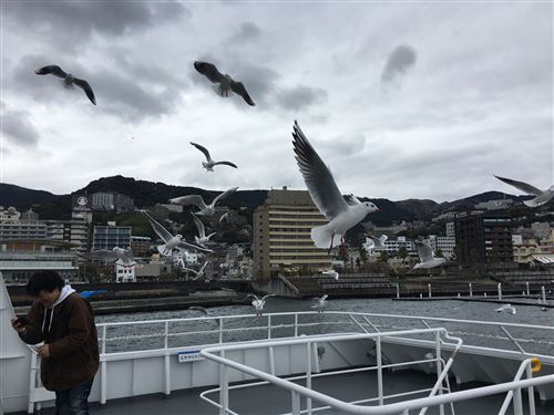 2日目は強風のため午前中の船が欠航になり、13時の定期船でなんとか熱海にたどり着きました。