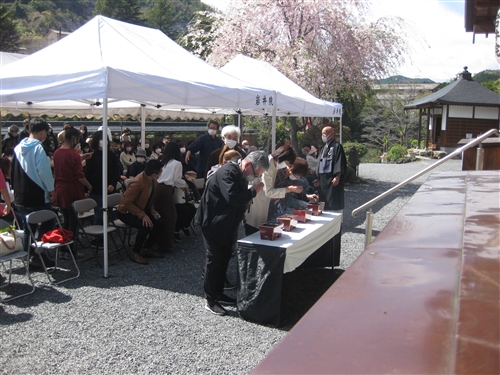 コロナウィルス感染症も新しいステージに入っていることもあり、昨年同様に親族・縁者のみなさまにご参加をいただいての法要を開催いたしました。当日はあいにくの雨模様だったため、本堂正面に大きなテントを設置して、午前と午後2回の法要をお勤めいたしました。